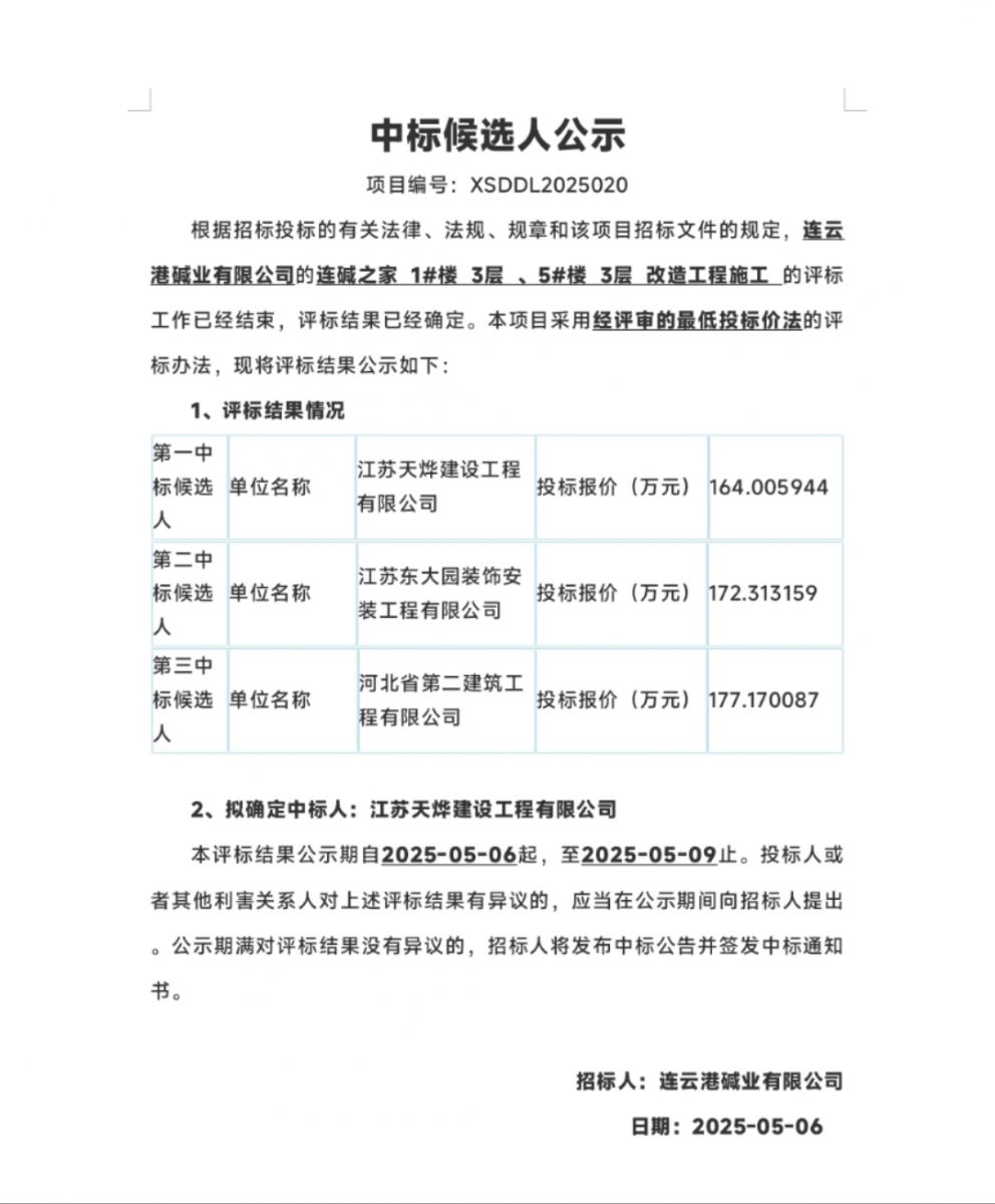 連云港堿業有限公司的連堿之家1#樓 3層 、5#樓 3層 改造工程施工中標候選人公示