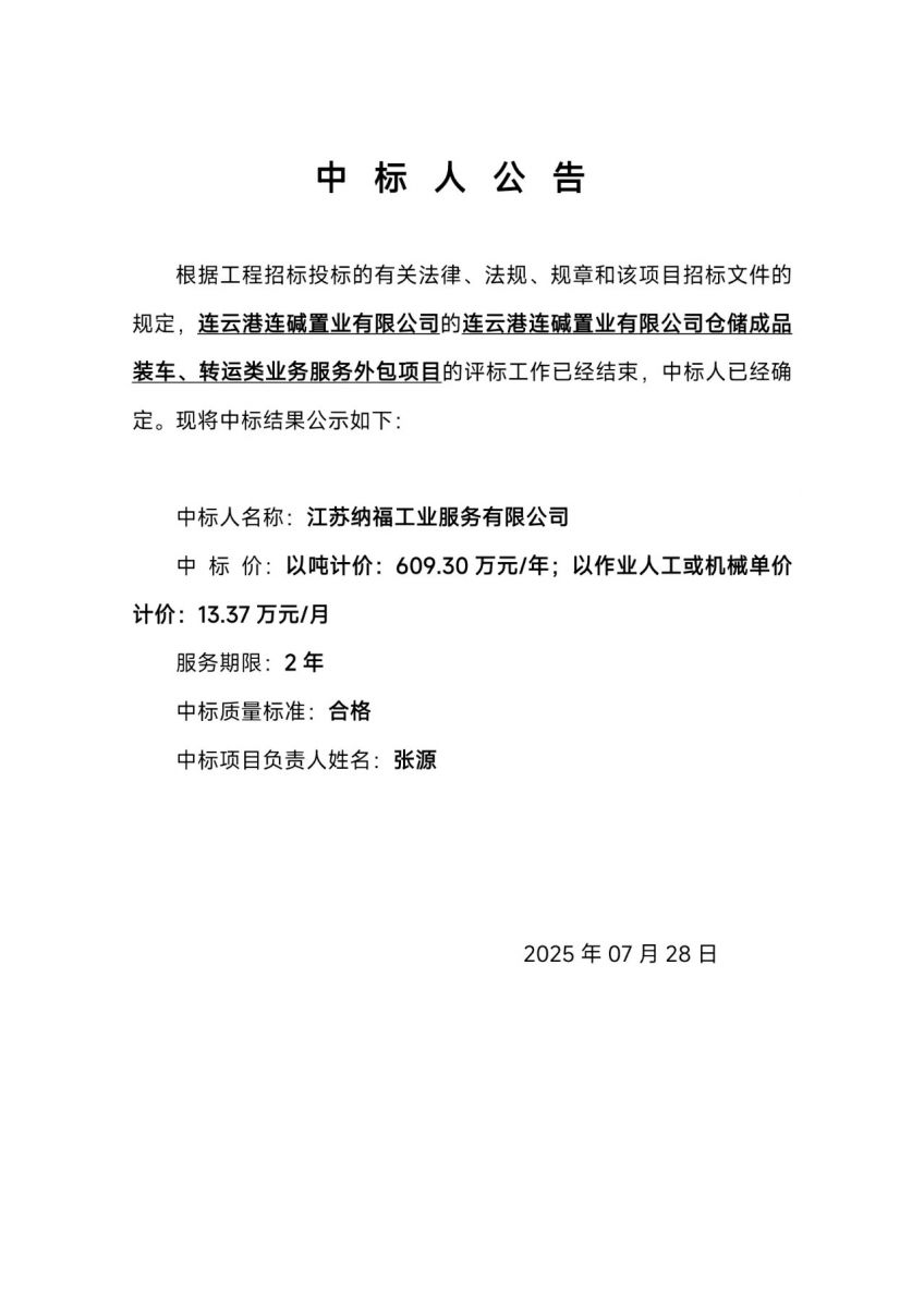 連云港連堿置業有限公司倉儲成品裝車、轉運類業務服務外包項目中標人公告
