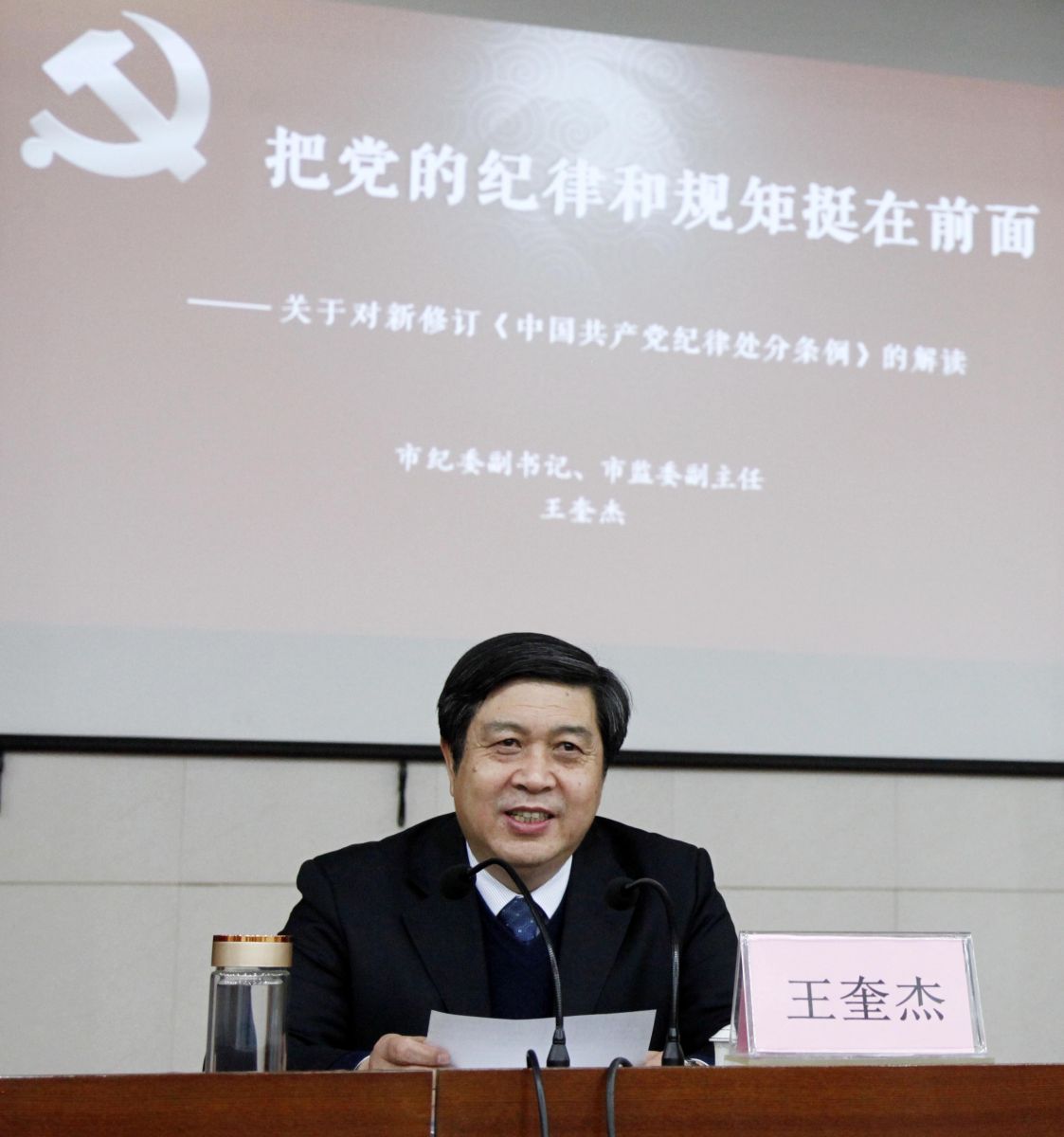 課上,王奎杰結(jié)合實際案例,以圖文并茂的形式,從修訂《條例》的重大意義、修改了哪些內(nèi)容、領(lǐng)導(dǎo)干部如何貫徹執(zhí)行好等三個方面,對《中國共產(chǎn)黨紀(jì)律處分條例》行了全面闡釋。并著重就如何把握《條例》的總則和違反政治紀(jì)律、組織紀(jì)律、廉潔紀(jì)律、群眾紀(jì)律、工作紀(jì)律、生活紀(jì)律的重點問題作了詳細(xì)講解。