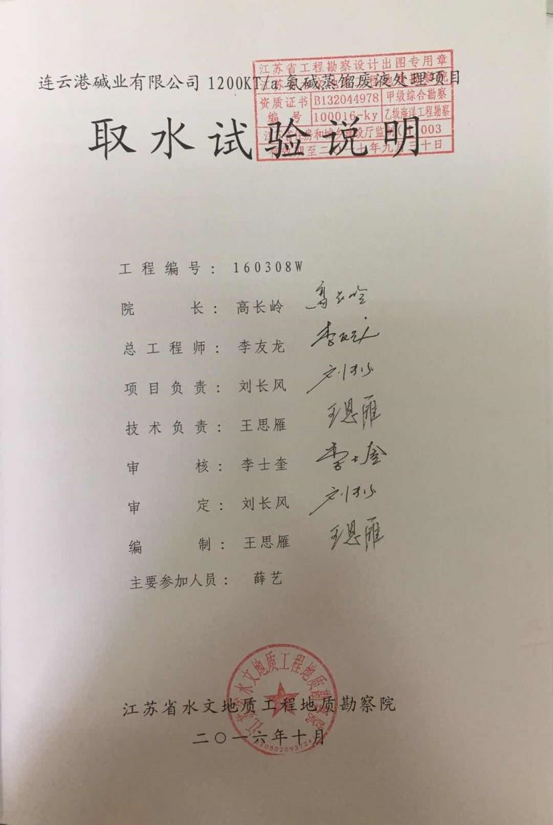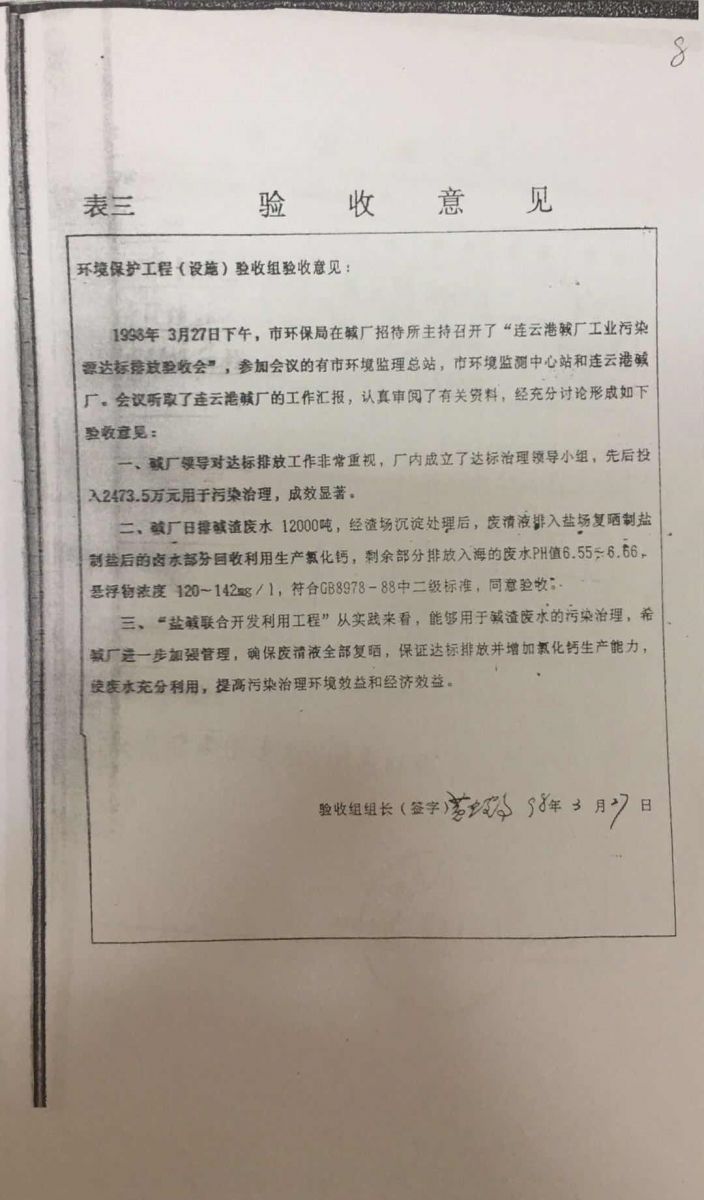 根據(jù)吉林化學(xué)工業(yè)公司設(shè)計院《連云港堿廠環(huán)境影響報告書》和原江蘇省環(huán)境保護局《關(guān)于對連云港堿廠環(huán)境影響報告書的批復(fù)》(蘇環(huán)管〔86〕31號)的要求,連云港堿廠產(chǎn)生的廢液送至渣場,經(jīng)澄清后,上清液經(jīng)自有排口閘直接排海。1997年,根據(jù)淮河流域水污染防治的要求,連云港市環(huán)保局向連云港堿廠下達了《關(guān)于淮河流域水污染源限期達標(biāo)排放的決定》(連環(huán)管〔1997〕16號)。據(jù)此,連云港堿廠與臺北鹽場合作開發(fā)了“堿渣場上清液回收利用工程”項目,利用上清液制鹽、制鈣。1998年3月27日,該項目通過連云港市環(huán)保局組織的環(huán)保驗收,正式運行。