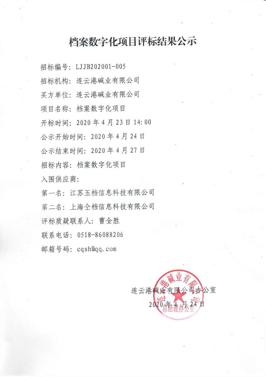 連云港堿業(yè)有限公司檔案數(shù)字化項(xiàng)目評標(biāo)結(jié)果公示