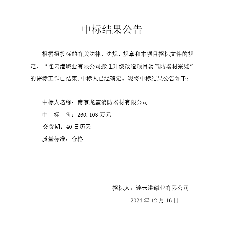 連云港堿業(yè)有限公司搬遷升級改造項目消氣防器材中標結(jié)果公告