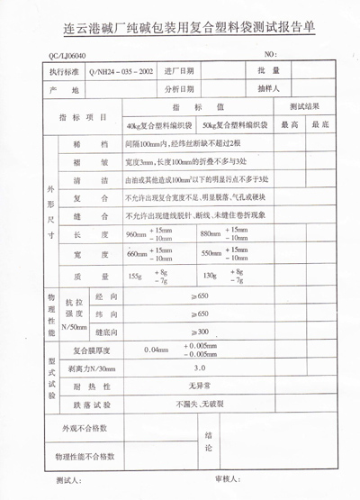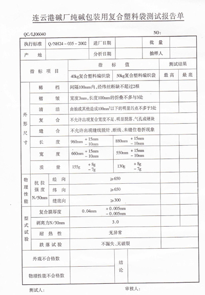 5.6 其他主要資格要求:具有合法有效的生產許可資質,企業制度完善、質量管理規范,具有完整的拉絲、織布、縫紉、檢測等生產線,注冊資金不少于500萬元(人民幣)。食品包裝袋投標人應具備食用包裝物生產許可資質,并提供第三方檢測報告。投標人必須送樣品袋先經我公司質檢部門檢測合格(2018年10月20日之前送到連云港堿業有限公司供應部,原招標人供應商不需送樣品袋)。符合法律、法規規定的其他條件。
