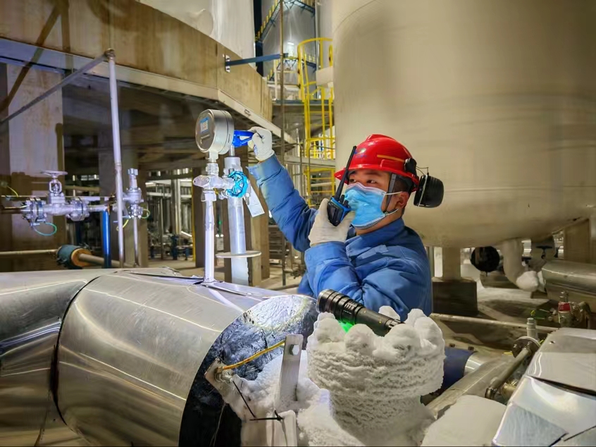 “春節(jié)期間,我們一定堅守崗位,保持最佳狀態(tài),確保各項工作有序推進。” 空分車間員工堅定地說道。“春節(jié)期間更要打起十二分精神,不能有絲毫懈怠。” 他們密切關(guān)注著設(shè)備的運行參數(shù),仔細記錄著每一個數(shù)據(jù)。“走,除夕夜檢查不能停,一定要確保萬無一失。”夜色中,他們頂著瑟瑟寒風(fēng)認真巡檢,檢查空壓機運行狀態(tài),保障儀表氣穩(wěn)定供應(yīng)。為了確保后序工段氮氣吹掃和密封氣供應(yīng),空分車間定時對真空液氮儲槽進行充液,為氮氣供應(yīng)保駕護航。
